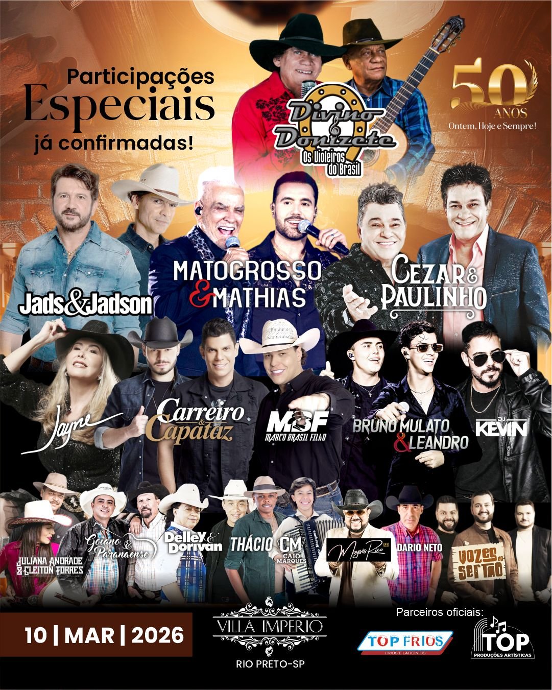 No dia 10 de março de 2026, a partir das 19h00, a gravação do DVD comemorativo de 50 anos de Divino & Donizete – Os Violeiros do Brasil vai marcar gerações na Villa Império.