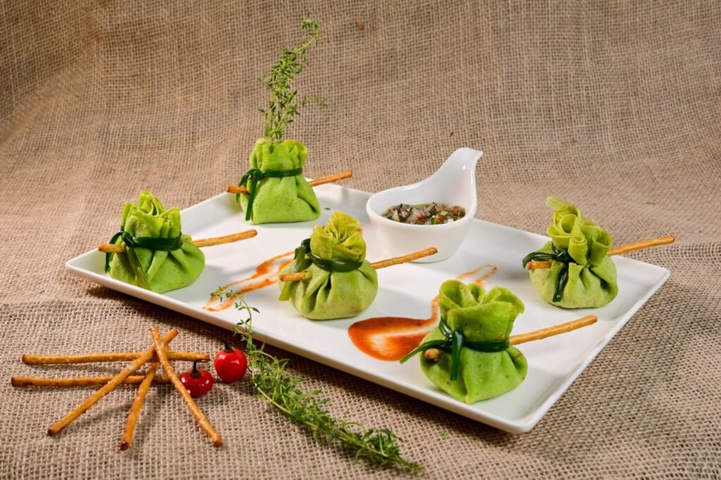 Petisco participante do desafio principal – Partiu de Matula (Trouxinhas de rúcula, recheada com palmito, alho-poró, espinafre, tomate, azeitonas picadas, cebola roxa, castanha de caju e catupiry, acompanhada de canudinho de chips)