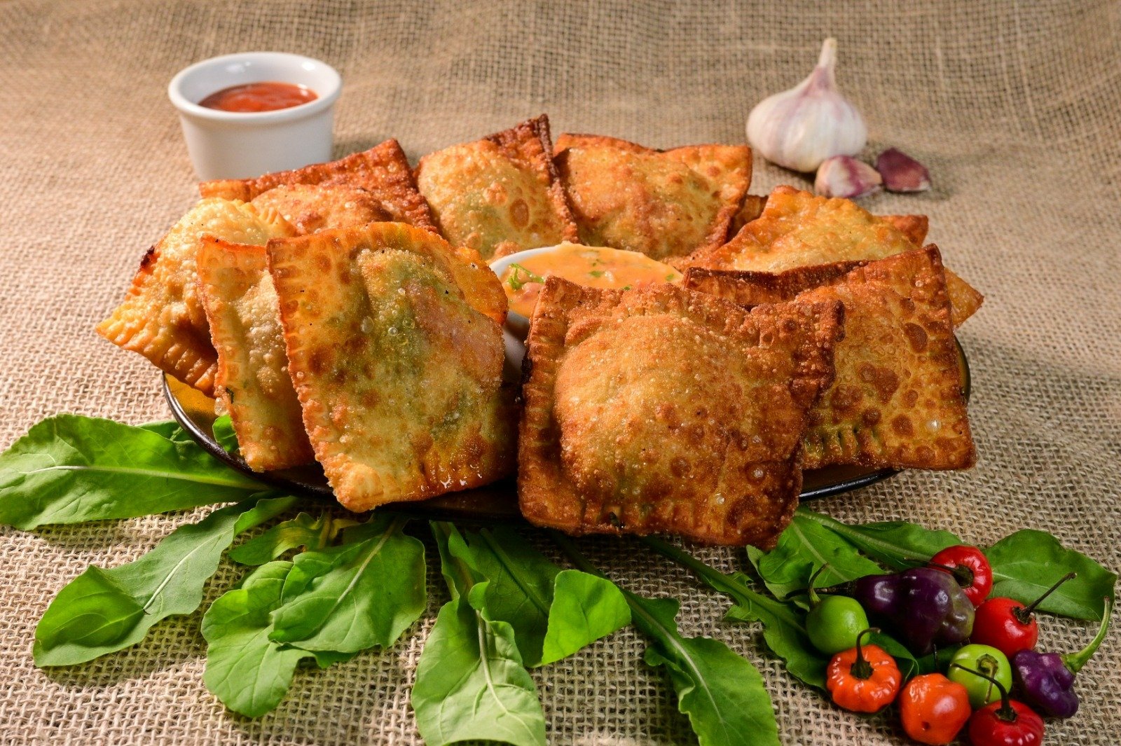 Petisco participante do desafio principal – Pastéis do Jack (Mini pastéis de costela com queijo, tomate seco e rúcula, acompanhados de geleia de pimenta e vinagrete)