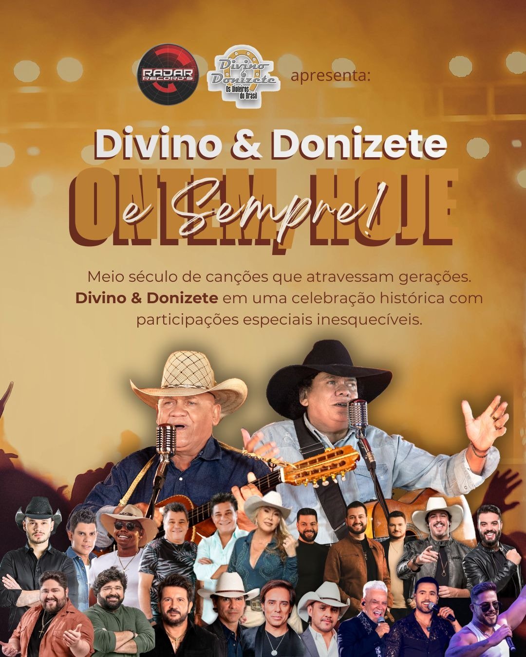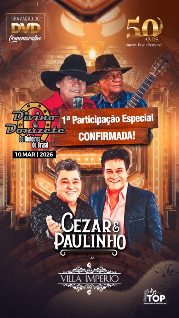 Abrindo a lista de grandes encontros que marcarão essa noite especial, está confirmada a 1ª participação especial: Cezar & Paulinho, dupla símbolo da tradição, da emoção e da autenticidade sertaneja. A presença dos artistas reforça a grandiosidade do projeto, que celebra meio século de história, sucessos e contribuição à cultura musical do país.