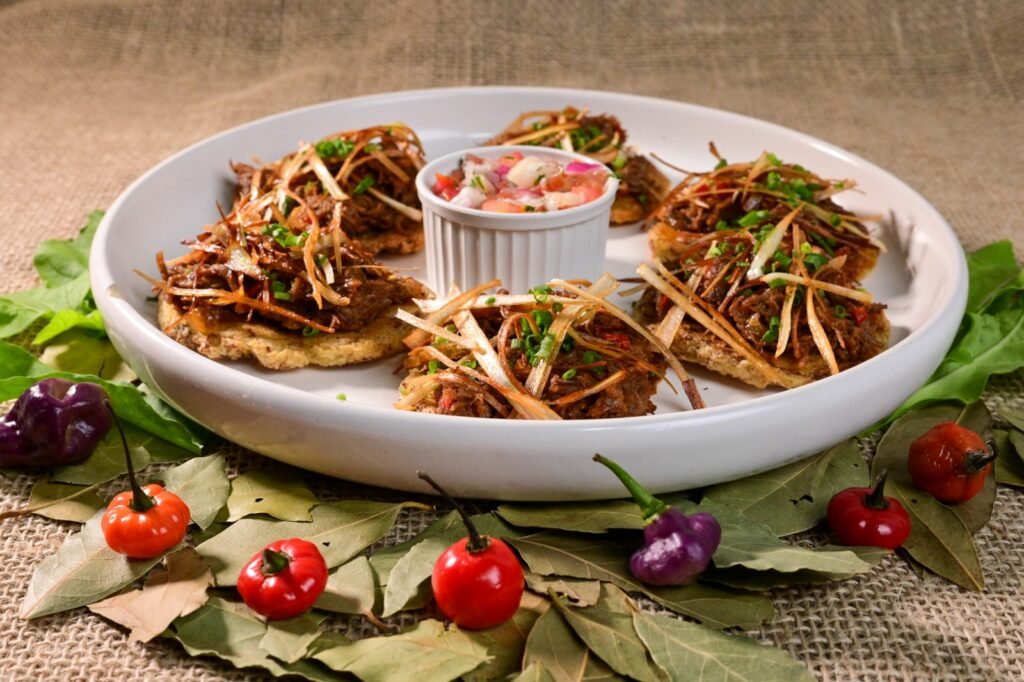 Petisco participante – Tostones (Base de mandioca assada, cobertura de ragu de costela com alho poró finalizado com crispys de alho poró, acompanha molho)