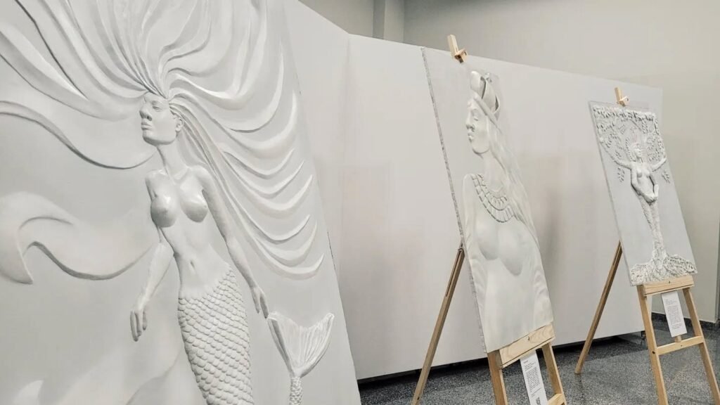 “Cada escultura recebe uma animação audiovisual desenvolvida especificamente para dialogar com sua forma, simbologia e materialidade. As projeções são mapeadas diretamente sobre os relevos em gesso, operando em sistema de loop, acompanhadas por trilha sonora e narração acessadas por fones de ouvido, o que permite ao visitante uma experiência simultaneamente visual, sonora e espacial”, explica a artista.