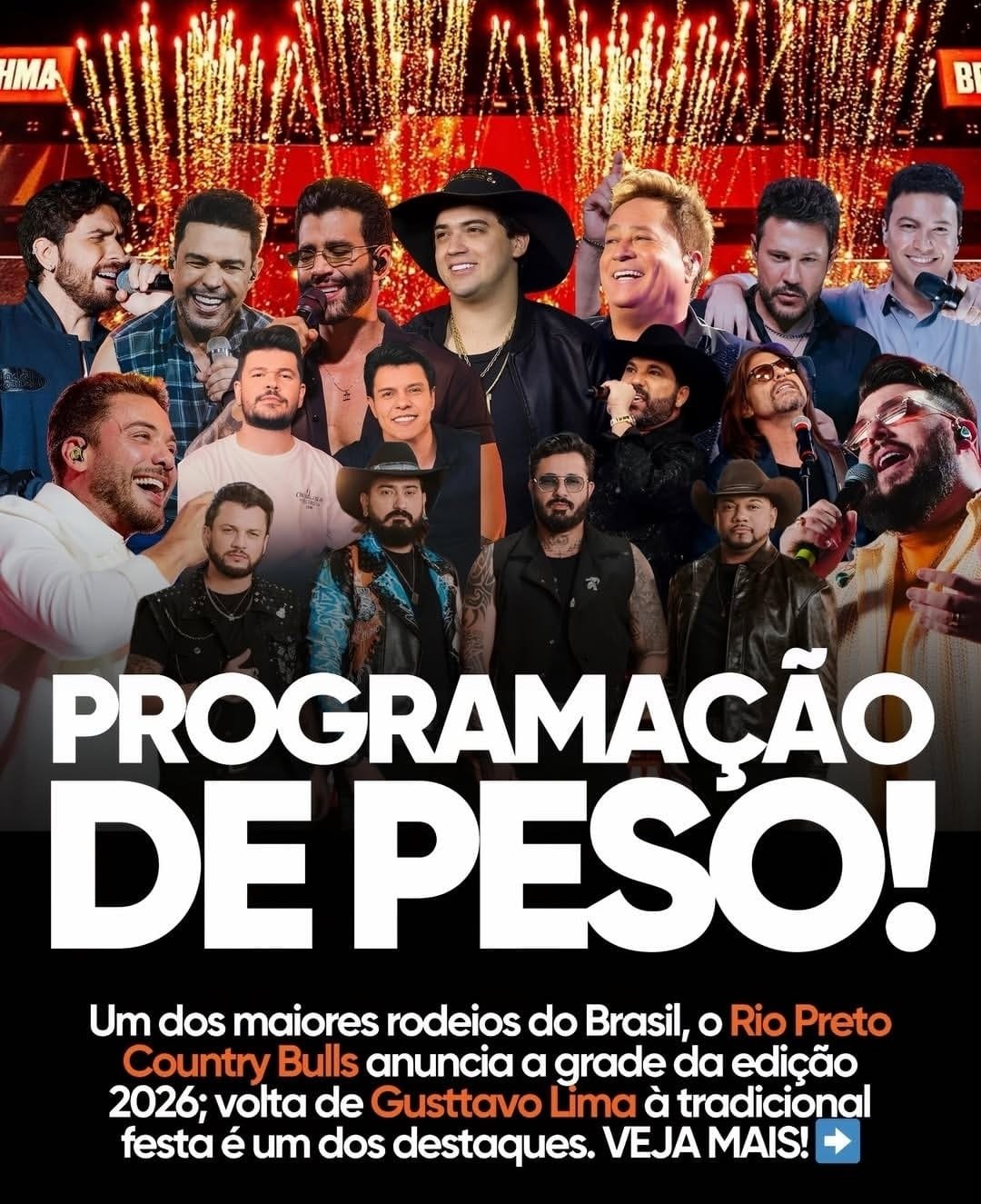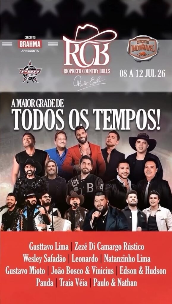 O Rio Preto Country Bulls (RCB) 2026 acontece de 8 a 12 de julho, no Recinto de Exposições Alberto Bertelli Lucatto, em São José do Rio Preto (SP), reunindo cinco noites de shows e as tradicionais provas de montaria em touros e cavalos. A programação começa na quarta-feira solidária em prol ao Hospital de Base (8) com Traia Véia e Paulo & Nathan; na quinta (9), sobem ao palco Edson & Hudson e Wesley Safadão; na sexta (10), é a vez de Zezé Di Camargo, Gustavo Mioto e Natanzinho Lima; no sábado (11), se apresentam Gusttavo Lima e João Bosco & Vinícius; e, no domingo (12), o encerramento será com Leonardo e Panda. Os ingressos serão vendidos pelo site www.countrybulls.com.br e nos pontos físicos no Rio Preto Shopping e no Shopping Cidade Norte.